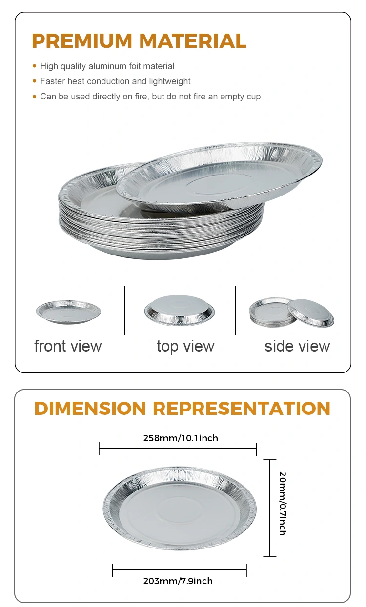„Yunchu“ aliuminio folija siūlo 10 colių picos keptuvę sidabro aliuminio folijos talpyklas su modelio numeriu 13110. Viršutinio skersmuo yra 258 mm (apie 10,1 colio), mažesnis 203 mm skersmuo (apie 7,9 colio), o aukštis - 20 mm (apie 0,7 colio). Turėdamas maždaug 695 ml (apie 24,5 uncijos) talpą, jis tinka kepti picą be prilipimo, lengvai atpalaiduojama iš pelėsio ir neturi kvapo. Be to, padidėjęs kraštų dizainas neleidžia ingredientams išsilieti ir padidina praktiškumą. Mes taip pat galime teikti logotipų pritaikymo paslaugas, kurios padės pagilinti klientų įspūdį ir padidinti jūsų prekės ženklo žinomumą.