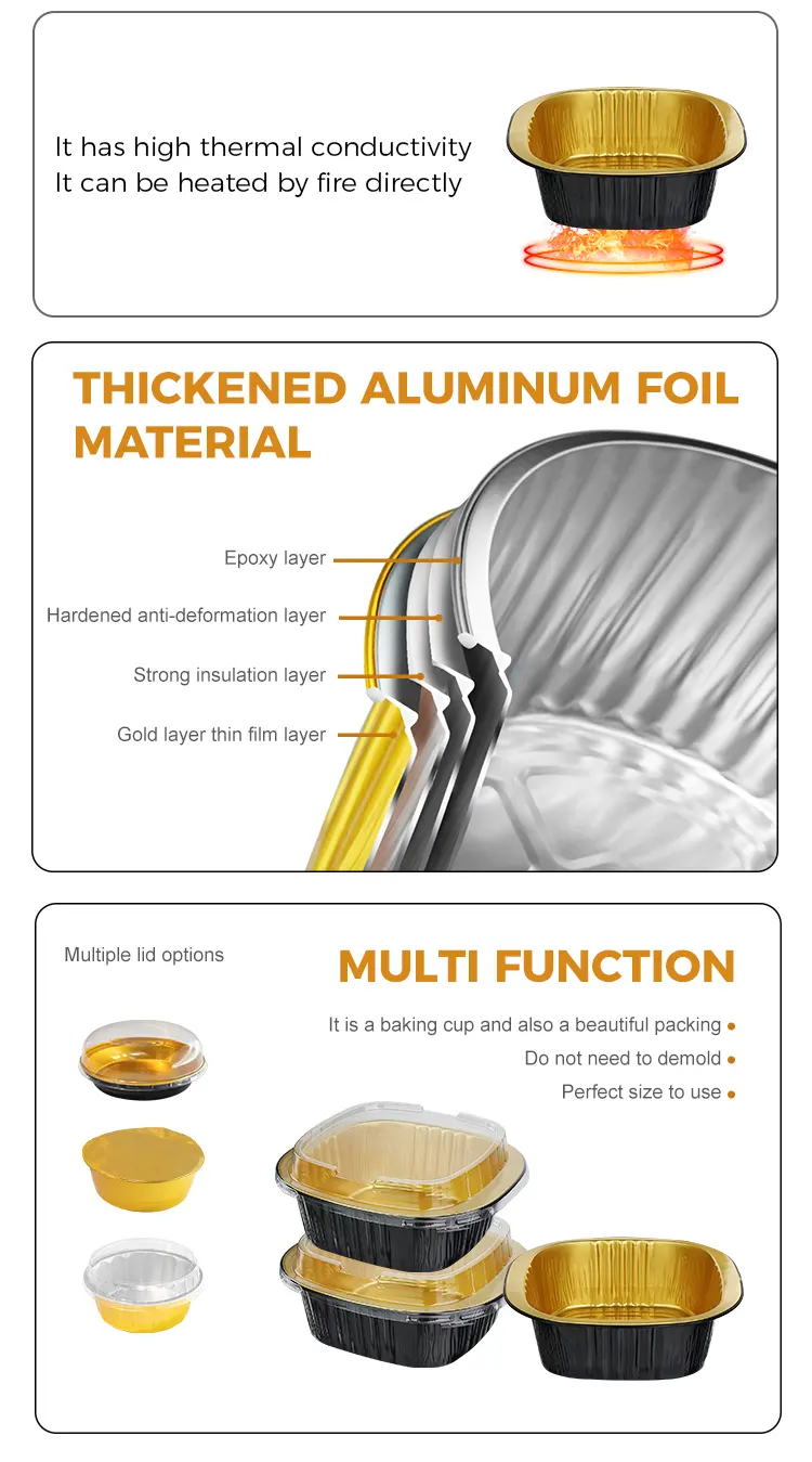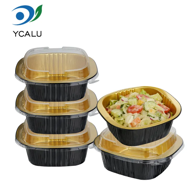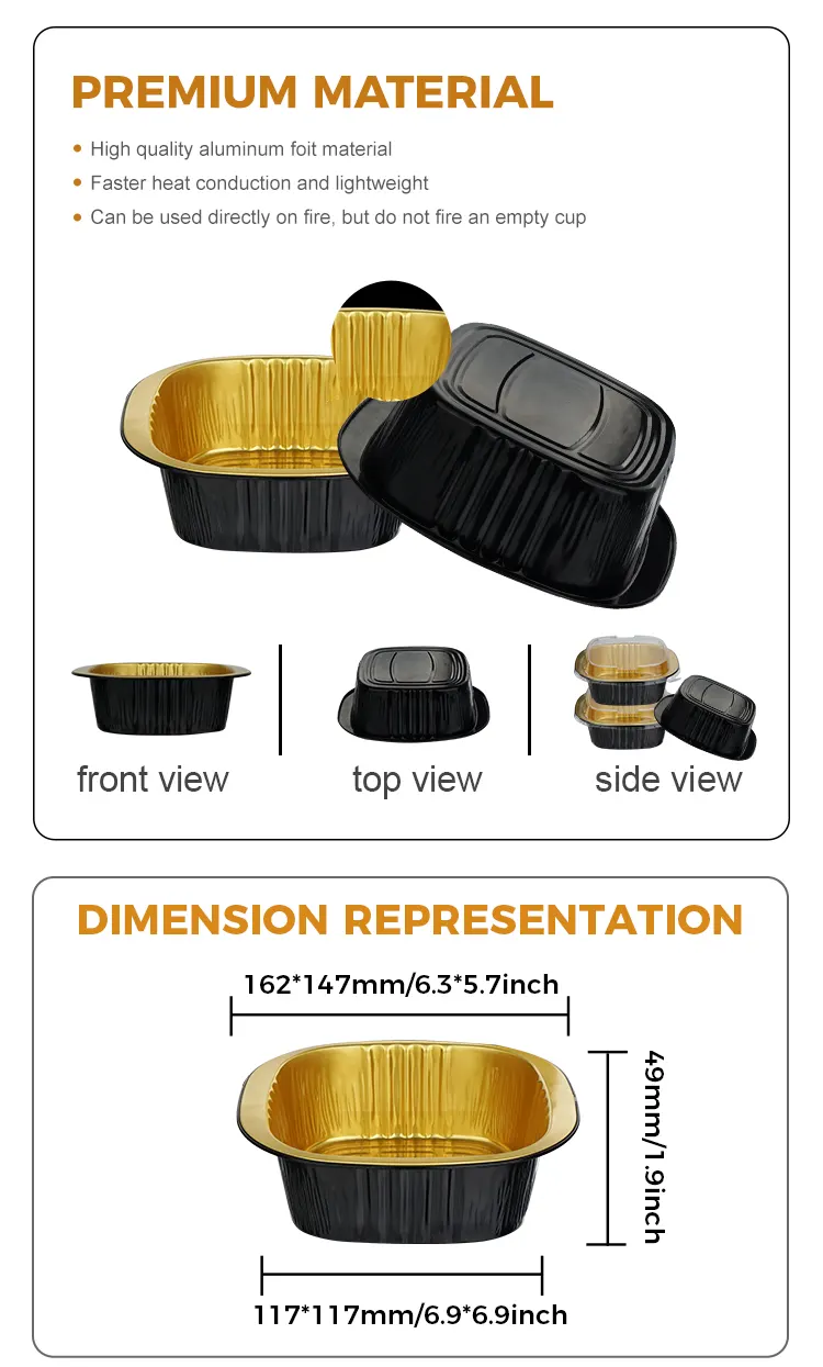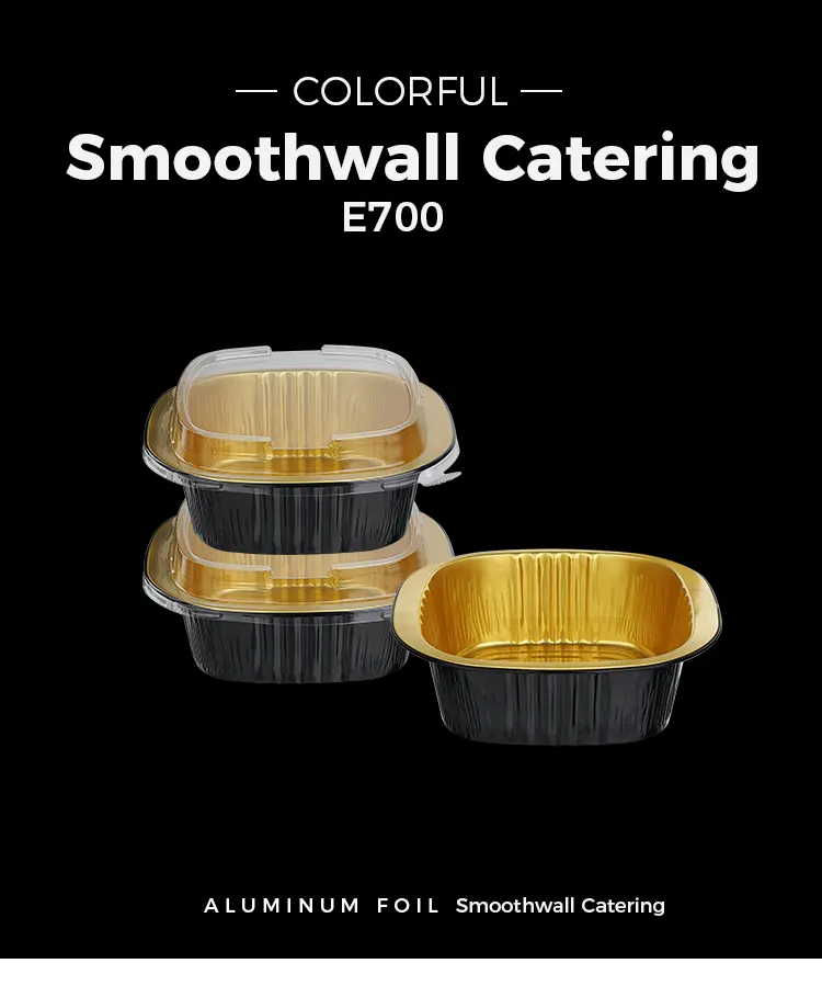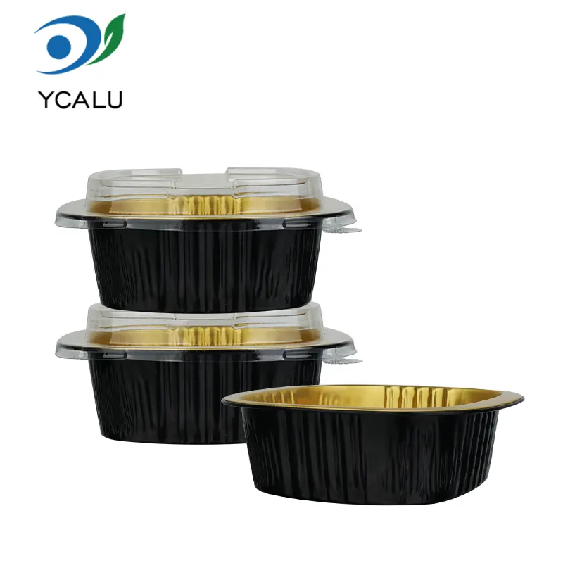 ​Yunchu aliuminio folijos tiekėjo vienkartinės binauralinės kvadratinės dėžutės juodo aukso šviesios sienelės aliuminio folijos konteineriai yra pagaminti iš maistinės 8011 aliuminio lydinio folijos. Jie buvo apdoroti aukštos temperatūros atkaitinimo ir sterilizavimo procesais, kad ant paviršiaus susidarytų tankus oksido sluoksnis. Jie neturi sunkiųjų metalų ir neturi kvapo. Jie gali tiesiogiai liestis su visų rūšių maistu ir užkirsti kelią kenksmingų medžiagų nusodinimui aukštoje temperatūroje. Nesvarbu, ar jie naudojami karštiems patiekalams, šaltiems patiekalams, desertams ar padažams laikyti, jie gali apsaugoti maisto saugą ir atitikti daugybę saugos sertifikatų, tokių kaip FDA ir SGS, todėl kiekvienas kąsnis yra saugesnis. Unikalus juodo aukso šviesios sienos dizainas sulaužo monotonišką tradicinių aliuminio folijos indų tekstūrą. Matinio juodo aukso danga ir lygus sienos paviršius suteikia aukščiausios klasės pojūtį. Jis ne tik turi išskirtinę išvaizdą, bet ir gali veiksmingai blokuoti šviesą ir deguonį, atitolinti maisto oksidaciją, tvirtai užfiksuoti maisto aromatą ir drėgmę, išvengti kvapų perdavimo ir ilgą laiką išlaikyti originalų maisto skonį. Lygus sienos paviršius neturi griovelių ar raukšlių, todėl mažiau linkęs daugintis bakterijoms ir jį lengva valyti. Jis taip pat gali geriau prisitaikyti prie spausdinimo tinkinimo, padėdamas viešojo maitinimo prekių ženklams pagerinti savo atpažįstamumą ir kokybę.