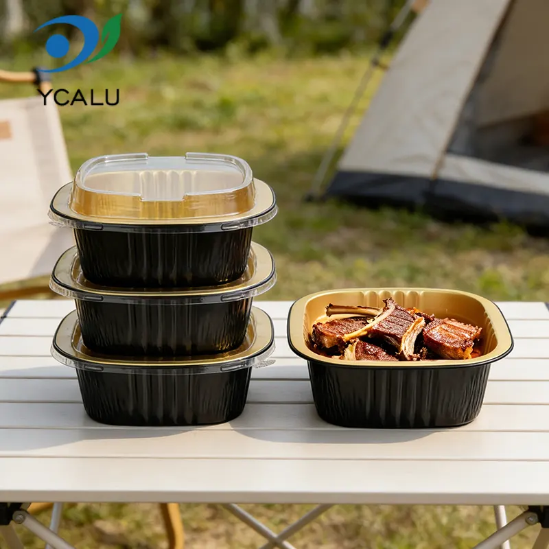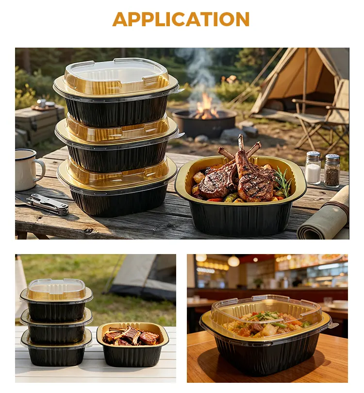 • Vienkartinės binauralinės kvadratinės dėžutės juodo aukso aliuminio folijos konteineriaiVienkartinės binauralinės kvadratinės dėžutės juodo aukso aliuminio folijos konteineriai