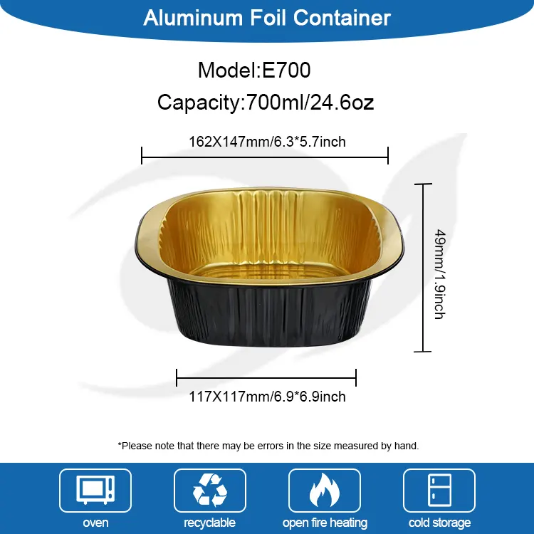 Yunchu aliuminio folijos tiekėjo vienkartinės binauralinės kvadratinės dėžutės juodo aukso šviesios sienelės aliuminio folijos konteineriai yra pagaminti iš maistinės 8011 aliuminio lydinio folijos. Jie buvo apdoroti aukštos temperatūros atkaitinimo ir sterilizavimo procesais, kad ant paviršiaus susidarytų tankus oksido sluoksnis. Jie neturi sunkiųjų metalų ir neturi kvapo. Jie gali tiesiogiai liestis su visų rūšių maistu ir užkirsti kelią kenksmingų medžiagų nusodinimui aukštoje temperatūroje. Nesvarbu, ar jie naudojami karštiems patiekalams, šaltiems patiekalams, desertams ar padažams laikyti, jie gali apsaugoti maisto saugą ir atitikti daugybę saugos sertifikatų, tokių kaip FDA ir SGS, todėl kiekvienas kąsnis yra saugesnis. Unikalus juodo aukso šviesios sienos dizainas sulaužo monotonišką tradicinių aliuminio folijos indų tekstūrą. Matinio juodo aukso danga ir lygus sienos paviršius suteikia aukščiausios klasės pojūtį. Jis ne tik turi išskirtinę išvaizdą, bet ir gali veiksmingai blokuoti šviesą ir deguonį, atitolinti maisto oksidaciją, tvirtai užfiksuoti maisto aromatą ir drėgmę, išvengti kvapų perdavimo ir ilgą laiką išlaikyti originalų maisto skonį. Lygus sienos paviršius neturi griovelių ar raukšlių, todėl mažiau linkęs daugintis bakterijoms ir jį lengva valyti. Jis taip pat gali geriau prisitaikyti prie spausdinimo tinkinimo, padėdamas viešojo maitinimo prekių ženklams pagerinti savo atpažįstamumą ir kokybę.