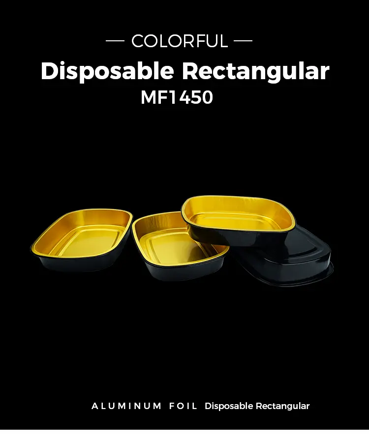 Vienkartinių juodo aukso kepimo skardos stačiakampio formos aliuminio folijos konteinerių MF1450 viršutinio skersmens yra 245*193 mm (9,6*7,5 colio), o apatinis skersmuo - 217*165 mm (8,5*6,4 colio), 45 mm aukščio (1,77 colio) ir maždaug 1450 ml (51,4 colio) aukštis.