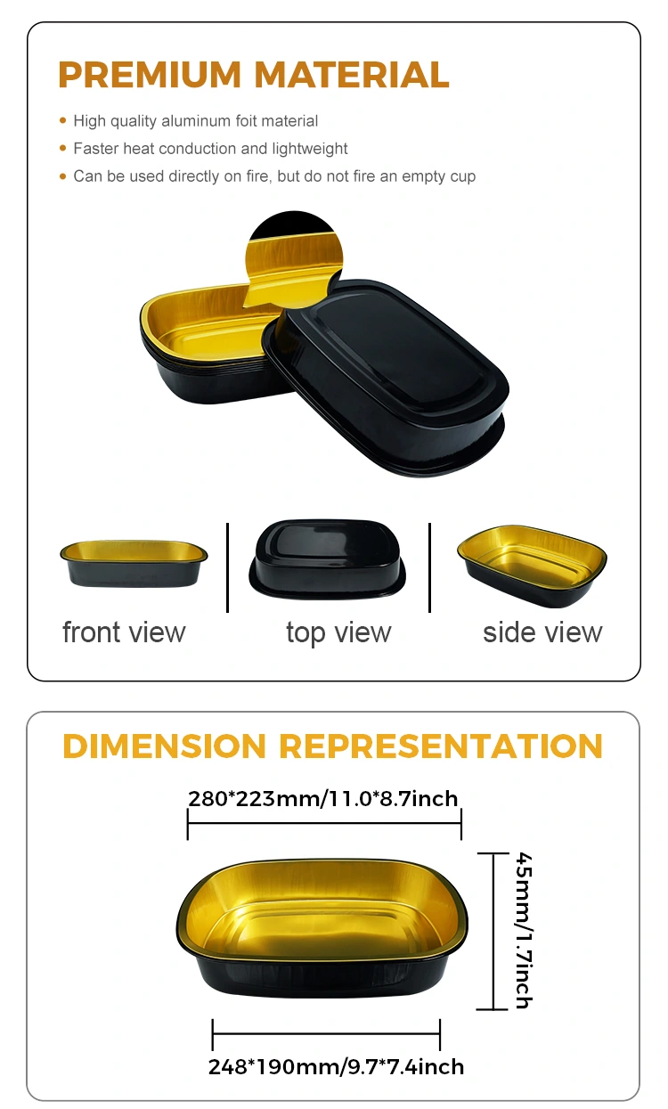 Yunchu Aluminum Foil Supplier Disposable black gold catering Rectangular Aluminum Foil Containers is suitable for large-volume catering and takeaway industries, especially suitable for baking, catering chains and self-service chains and other scenarios, the product is made of 8011 food-grade aluminum foil material, the height is low and suitable for some turkey, grilled fish, stew and other foods with Daugybė ingredientų gali būti naudojami su aliuminio folijos sandarinimo dangčiu ir PET visiškai skaidriu dangčiu, pasižyminčiu puikiu sandarinimo efektyvumu, aukšto temperatūros atsparumu ir alyvos bei nuotėkio prevencijos funkcija. Jis plačiai naudojamas įvairiuose scenarijuose, tokiuose kaip maisto pakuotė, šildymas, šaldymo ir išsinešimo pristatymas. Paviršius pritaiko lengvą sienos dizainą, pasižymintį plokščiu ir sklandžiu išvaizda, kuri patogiai yra automatiškai užklijuoti šilumos užklijuotą plėvelę, taip pagerinant pakavimo efektyvumą.