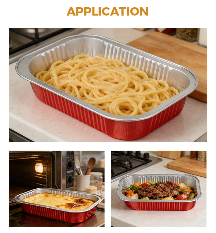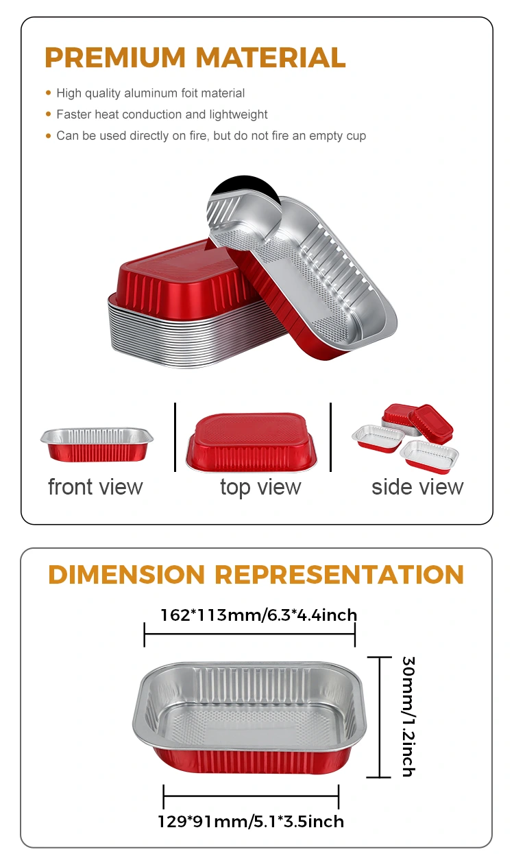- Stačiakampio raudono aliuminio išsinešimo konteinerio medžiaga gali užfiksuoti maisto šviežumą ir šviežumą. Puikios šilumos laidumo ir izoliacinės savybės leidžia jį tiesiogiai kaitinti orkaitėje, mikrobangų krosnelėje ir šaldyti šaldytuve, efektyviai užfiksuojant originalų patiekalo skonį ir ilgą laiką išlaikant idealų skonį.