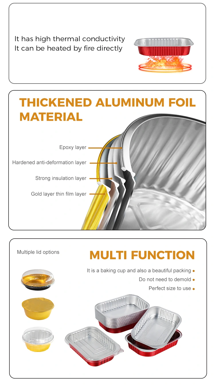Vienkartinio maitinimo sandariklio raudonos kvadratinės aliuminio folijos konteinerio specifikacijos yra įvairios (su skirtingos talpos pasirinkimais), pradedant nuo mažų patiekalų porcijų, specialių užkandžių iki patiekalų ir sriubų šeimos susibūrimams – visa tai galima tiksliai suderinti. Vienkartinio naudojimo funkcija pašalina valymo poreikį, sumažina darbo ir valymo medžiagų sąnaudas maitinimo įmonėms. Tai taip pat pašalina valymo po valgio vargo tokiais atvejais, kaip šeimos susibūrimai ir veikla lauke, todėl tai yra efektyvu, patogu ir be streso.