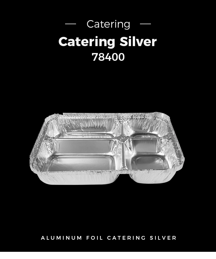 Yunchu Aluminum Foil Supply Factory launched a new Disposable multi-compartment fast food Silver Aluminum Foil Containers, model number 78400. The container is cleverly designed, with an upper diameter of 244 mm (9.6 in) and 195 mm (7.6 in) and a lower diameter of 217 mm (8.5 in) and 168 mm (6.6 in), with an overall height of only 41 mm (1.6 in). Jei talpa yra maždaug 1020 ml (36,0 uncijos), jis yra patogus ir praktiškas norint laikyti įvairius maisto produktus keturiuose skyriuose.