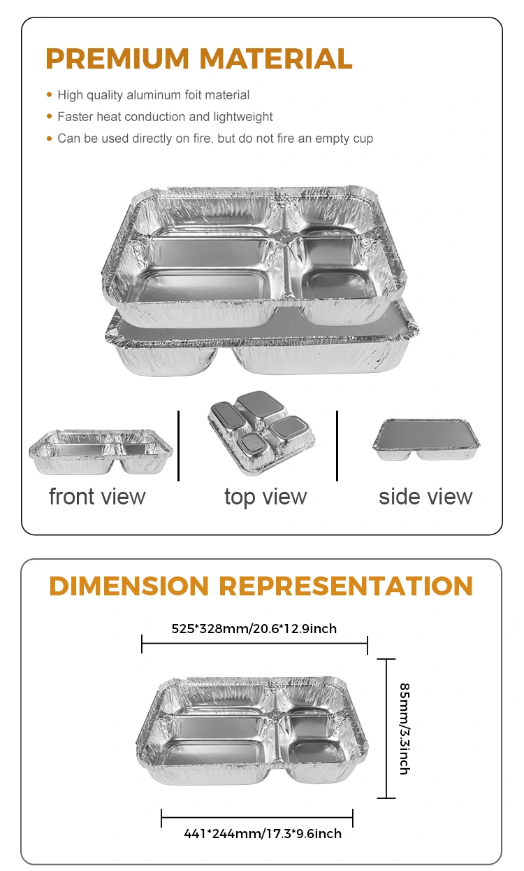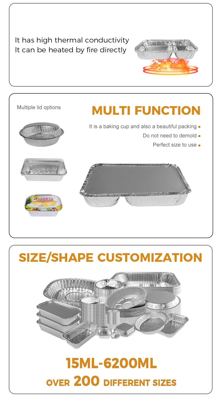 Ši folijos priešpiečių dėžutė turi lygų paviršių, kuris suteikia jai švarų ir švarią pojūtį. Dėl įprastos jos formos lengva prisitaikyti prie įvairių pakuočių ir transportavimo reikalavimų, tokių kaip sudėjimas ir išdėstymas.