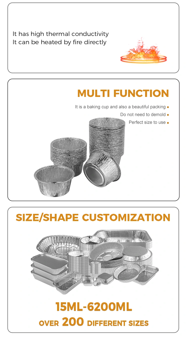 Šis vienkartinis apvalus pyrago padėklas Sidabrinės aliuminio folijos indelis turi klostuotas formas, kurias lengva tvarkyti ir tinka įvairiems skanėstams gaminti, nesvarbu, ar tai būtų pyragai, pudingi ar plikyti kiaušiniai. Talpykla pagaminta iš aukštos kokybės aliuminio folijos medžiagos, kurios paviršius yra lygus ir švelnus, jį lengva valyti. Be to, ši medžiaga taip pat pasižymi geru atsparumu aukštai temperatūrai ir gali atlaikyti aukštesnę nei 200°C temperatūrą, užtikrinant saugų maisto gaminimą.