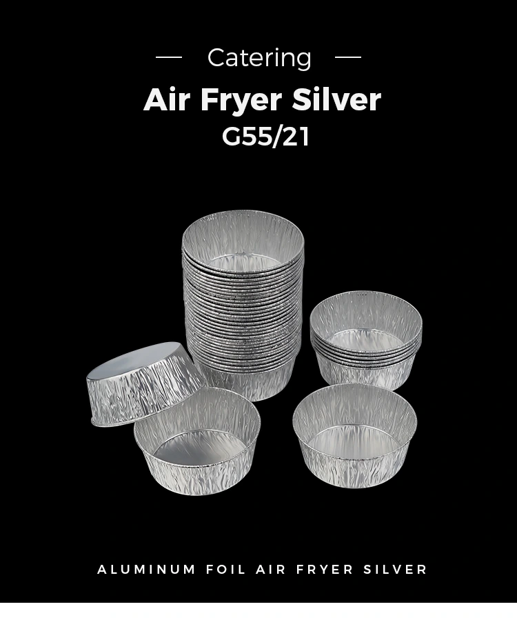 • Vienkartinės sidabrinės apvalios oro gruzdintuvės Sidabrinės aliuminio folijos maisto konteineriaiVienkartinės sidabrinės apvalios oro gruzdintuvės Sidabrinės aliuminio folijos maisto konteineriai