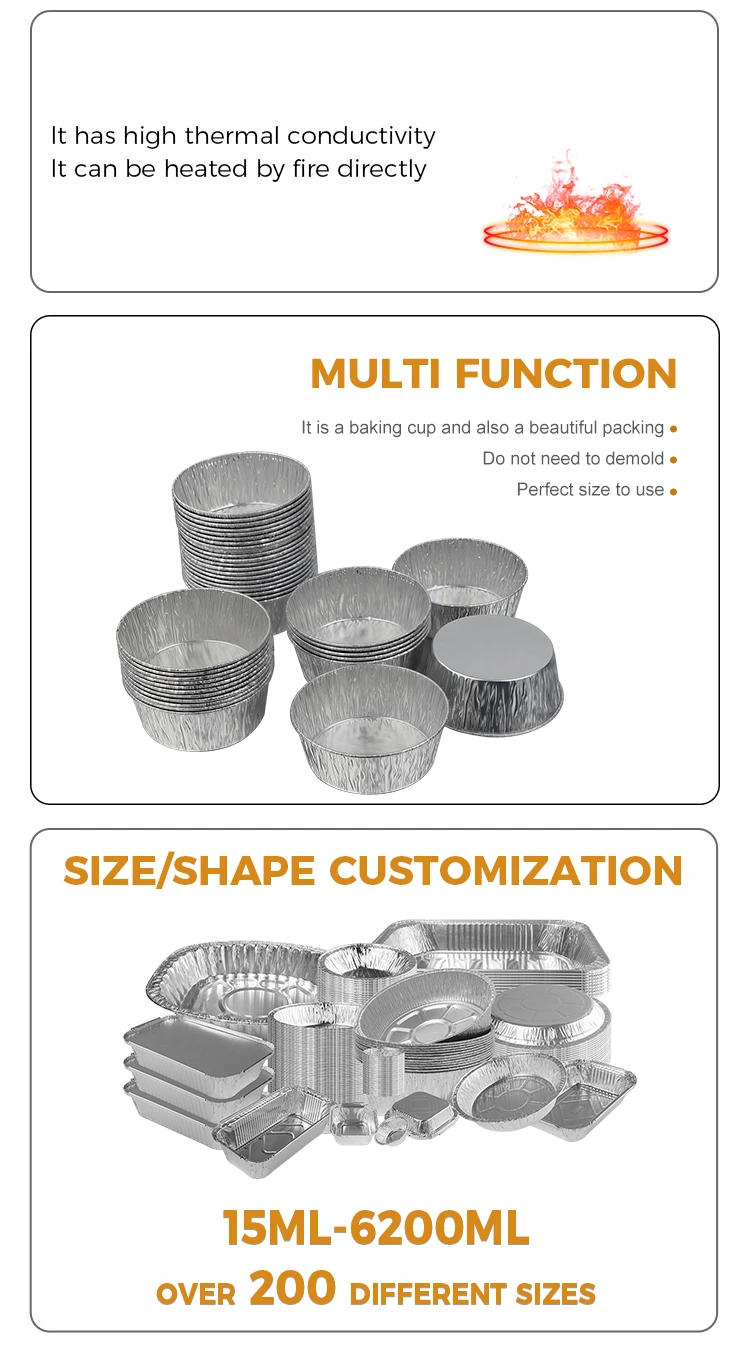Yunchu aliuminio folijos tiekėjo vienkartinė sidabrinė apvali panardinama oro gruzdintuvė sidabrinė aliuminio folijos talpykla yra pagaminta iš maistinės sutirštintos aliuminio folijos. Jis yra saugus, neturi kvapo ir neturi kenksmingų kritulių. Jis gali tiesiogiai susisiekti su visų rūšių panardinamomis medžiagomis. Šią mažą aliuminio folijos talpyklą galima sukrauti, kad sutaupytumėte vietos, nesideformuotų ir nepratekėtų. Sidabrinė aliuminio folija turi vienodą tekstūrą ir puikų šilumos laidumą. Jis gali būti naudojamas restoranuose, kavinėse, šeimos susibūrimuose ir pan. Jis naudojamas su užkandžiais keptuvėse ir pan. Net jei jame yra tirštų padažų ir riebių padažų, jis neištekės. Stalviršis ir virtuvės reikmenys išliks švarūs ir tvarkingi. Folijos pateikimas paprastas ir gražus įvairiose scenose. Sidabrinė išvaizda gali būti derinama su įvairiomis pietų lėkštėmis.