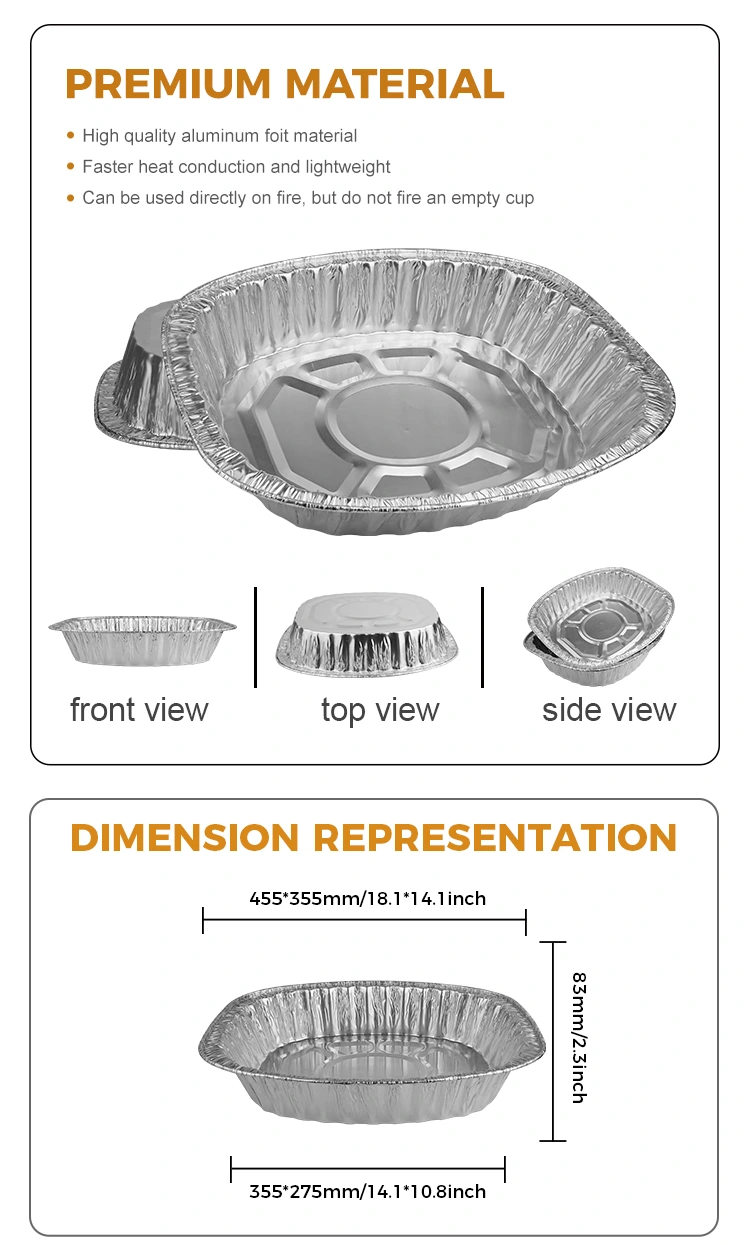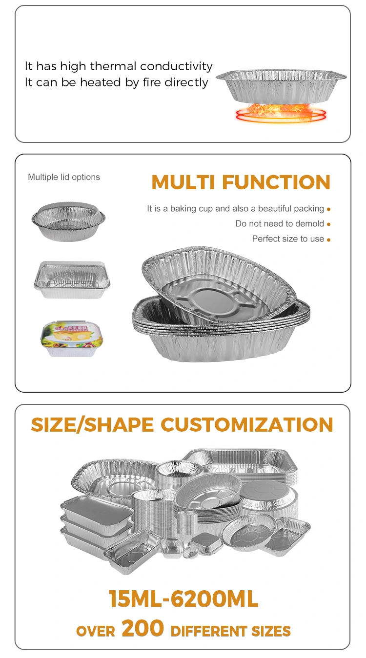Šis produktas yra vienkartinis produktas ir jo nereikia valyti, o tai taupo darbo sąnaudas. Jis gali būti suporuotas su PET visiškai skaidriu aliuminio folijos dangčiu, kuris efektyviai apsaugo nuo dulkių ir skysčių nuotėkio. Produkto ilgaamžiškumą ir saugumą sustiprina standžiųjų medžiagų projektavimas ir įprasta dugno įgaubta ir išgaubta forma. Nešiojamasis dizainas leidžia lengvai nešiotis ir šildyti, atsparios aukštai ir žemai temperatūrai, gali būti naudojama nuo –20 ° C iki 250 ° C, ir yra nepralaidus naftai ir vandeniui, padidindamas produkto šilumos sulaikymą ir transportavimo sandarumą.