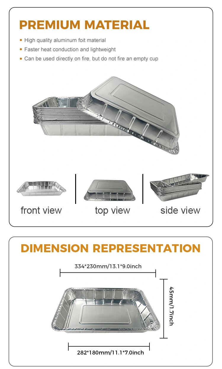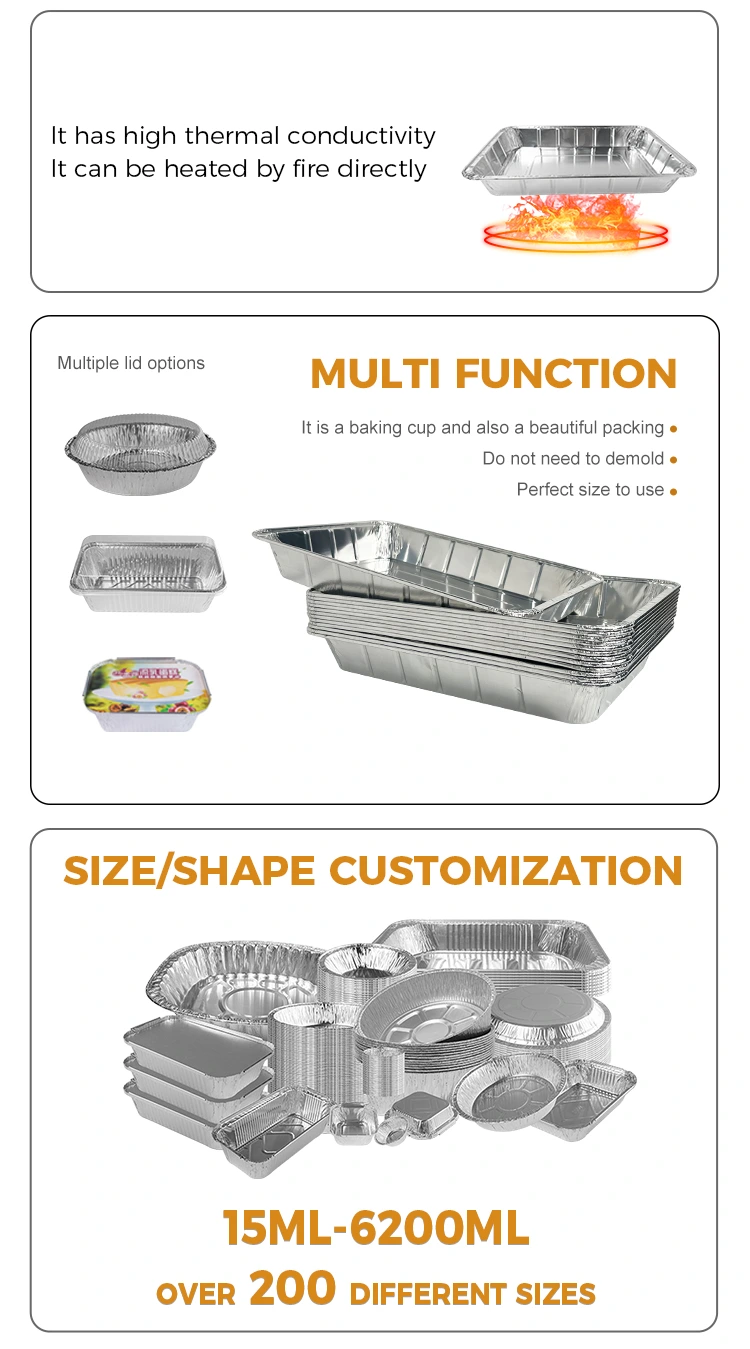 „Yunchu“ aliuminio folijos tiekėjas Didelis keptas žuvis, išims iš sidabro aliuminio folijos folijos konteinerių, patenkina įvairius maisto gaminimo poreikius, tinkamus įvairioms progoms, tokioms kaip oro kepėjai, kepsninės grotelės, roissirinės krosnys ir jūros gėrybių gamyba. Šis aliuminio folijos talpykla yra specialiai sukurta su pakeltu kraštu, kad būtų galima efektyviai užkirsti kelią maistui išsilieti ir prilipti prie puodų sienos, ir apsaugo keptuvės įdėklą keliais sluoksniais, o tai yra praktiška ir be rūpesčių. Jis pagamintas iš maisto lygio 8011-0 medžiagos, kurios šilumai atspari temperatūra iki 520 ° C, nėra nudegusi ar sulaužyta, o sutirštinta medžiaga nėra lengva deformuoti. Aliuminio folijos dėžutė yra sutirštinta kaip visuma, todėl galite lengvai ją pasiimti po virimo, nesijaudindami dėl deformacijos naudojimo metu. „Hemmed“ dizainas leidžia patogiai laikyti, o kraštai suapvalinti, todėl jums nereikia jaudintis, kad subraižysite pirštus. Sklandžius kraštus papildo PET visiškai skaidrūs dangteliai ir aliuminio folijos folijos folijos dangteliai, todėl jie yra tinkamesni įvairiems virimo būdams.
