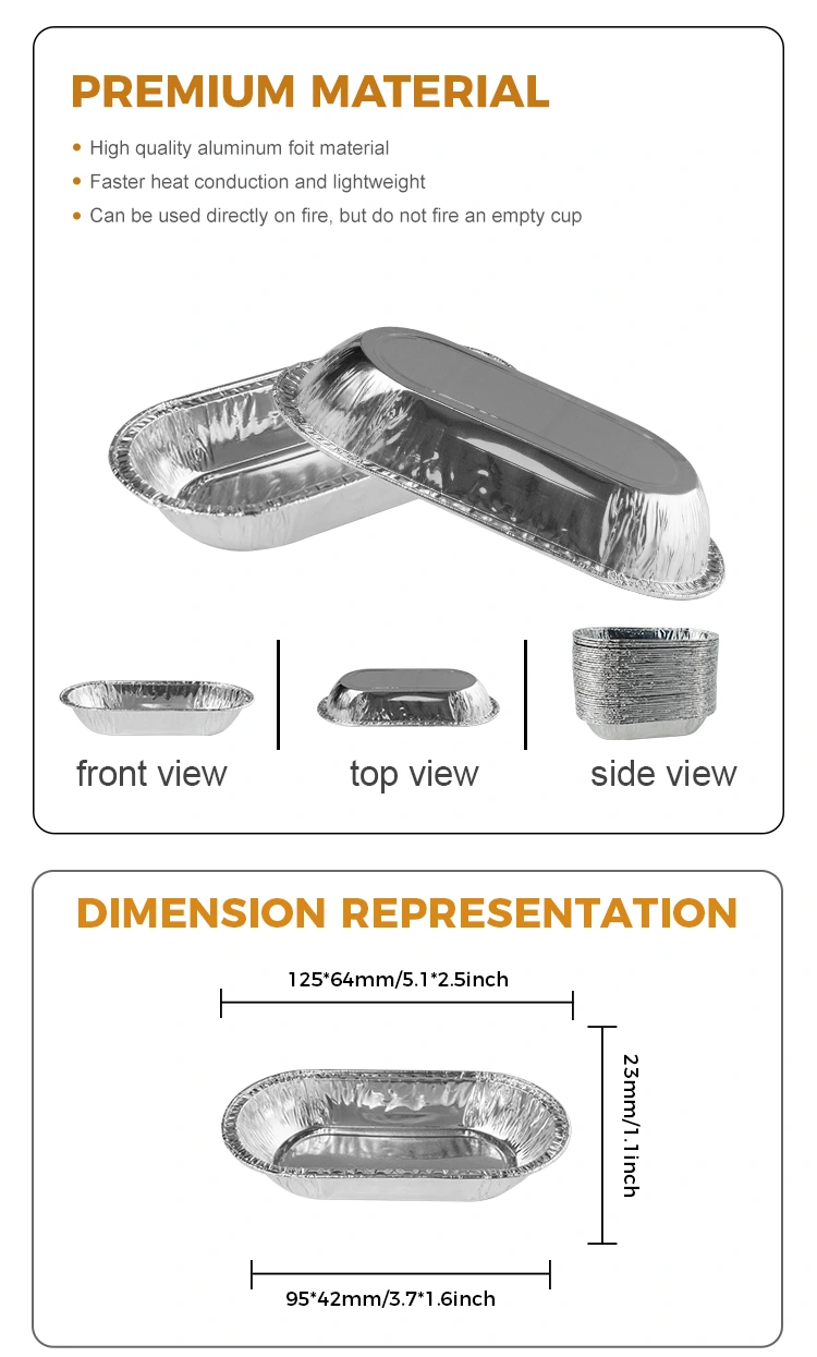 „Yunchu“ aliuminio folijos ovalus kepsnys sidabro aliuminio folijos maisto konteineris yra mažos talpos aliuminio folijos konteineris, skirtas ilgoms duonoms, keptiems sausainiams, maitinimui, austrėms, padažams ir kitiems maisto produktams. Jis ne tik tinka pakuotėms padažams, kritimams, mažiems pagardams ir kepimo mėginiams, bet ir ypač tinka padažams rodyti ir išduoti. Konteineris pagamintas iš maisto produktų aliuminio folijos medžiagos, suformuotos į vieną gabalą su veidrodžiu panašia lygią sieną, kuri yra ir graži, ir praktiška, kuri gali žymiai sustiprinti bendrą pakuotės tekstūrą, ypač tinkama tiems maisto paslaugų scenarijams, kurie atkreipia dėmesį į detales ir aptarnavimo kokybę.