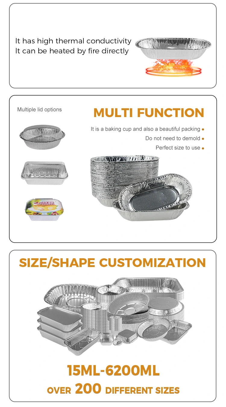„Oval“ kepsnys sidabro aliuminio folijos maisto konteineris 6005 yra tinkamas maitinimo, išsinešimo pristatymo platformai, dideliems pokylių, savitarnos ir kitoms progoms, ir gali būti naudojamas mažiems pyragams, sausainiams, šokoladams, padažams ir kitiems maisto produktams laikyti. Nesvarbu, ar jis suporuotas su įvairiais padažais, ar kaip keptų desertų garnyras, ši kompaktiška folijos dėžutė yra puikus jūsų patiekalo priedas. Lengvas ir patvarus, talpykla pagaminta iš aukštos kokybės aliuminio folijos, o viršuje yra pritaikytas skaidrus naminių gyvūnėlių dangtis, o apačioje-fiksuotas dangtis, kad maistas nepriliptų prie kepimo skardos, todėl jį lengva išlaisvinti ir valyti, taip pat lengvai gabenamas ir naudojamas.