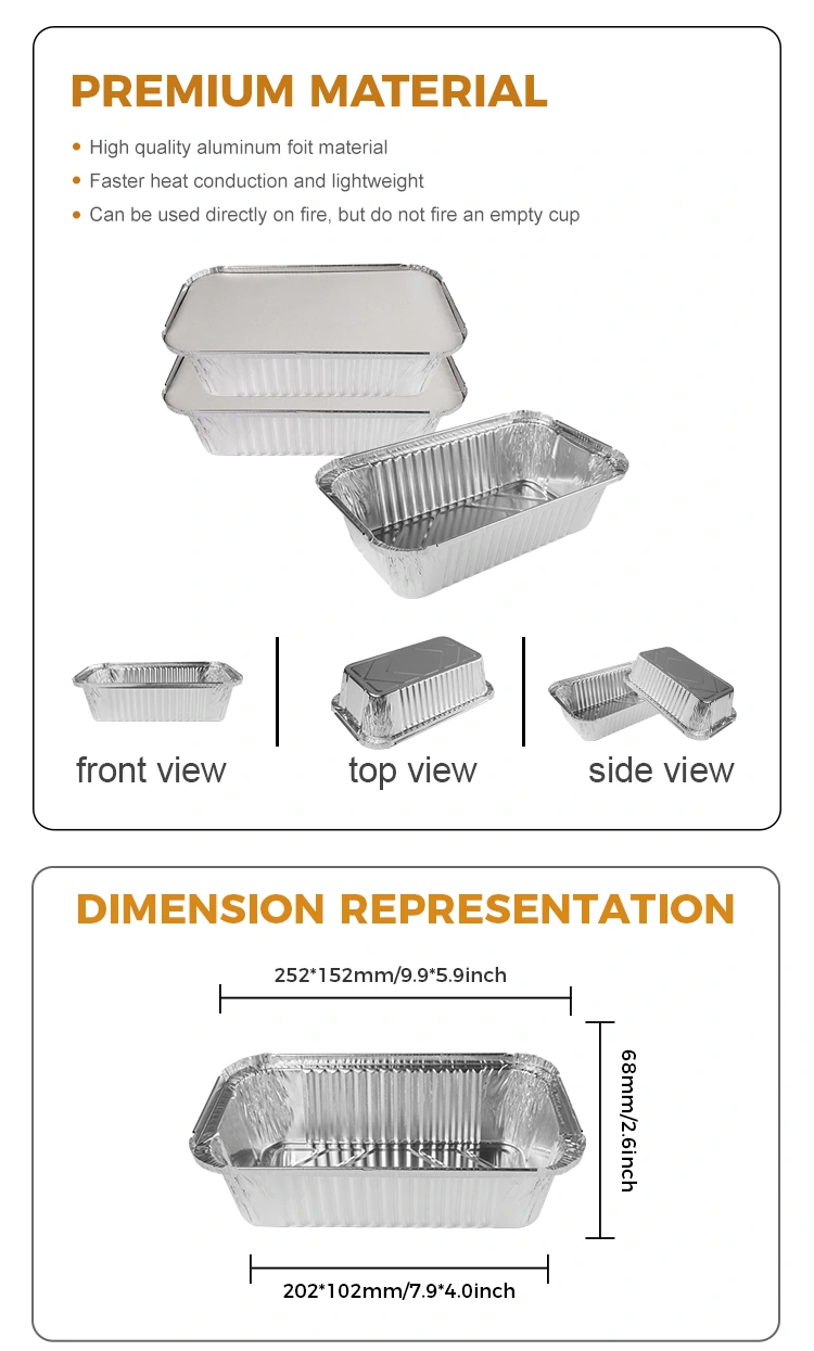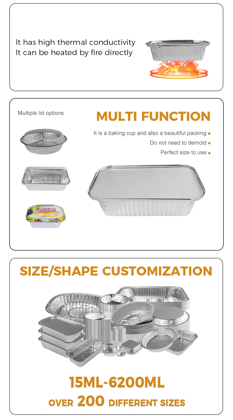 „Yunchu“ aliuminio folija Ši stačiakampio oro keptuvės pakavimo sidabro aliuminio folijos talpyklos yra pagamintos iš aukštos kokybės 8011 aliuminio folijos medžiagos, pasižyminčios puikiu šilumos izoliacijos veikimu ir gali efektyviai išlaikyti maisto temperatūrą, todėl maistas tampa skanesnis ir skanesnis. Tuo pačiu metu mūsų stačiakampiame BBQ sidabrinio aliuminio folijos talpykloje taip pat yra šilumos išsaugojimo funkcija, kurią galima pasiekti suderinus jį su aliuminio folijos dangčiu arba PET plastikiniu dangčiu, kuris yra patogus pritaikytam logotipui ir taip sustiprinant prekės ženklo vaizdą.
