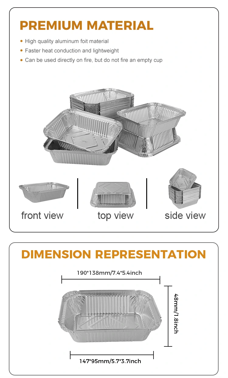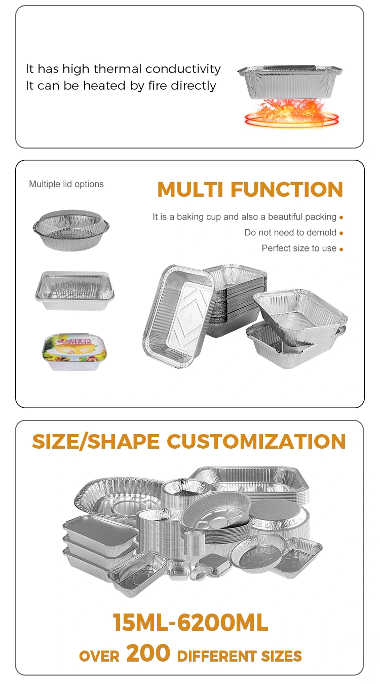 Mūsų teikiamos aliuminio folijos priešpiečių dėžutės yra pagamintos iš 8011 aliuminio folijos medžiagos, kuri pasižymi puikiomis termoizoliacinėmis savybėmis ir gali efektyviai palaikyti maisto temperatūrą. Visų pirma, mūsų stačiakampė sidabrinė aliuminio folijos talpykla, skirta priešpiečių dėžutėms kepti, turi ne tik šilumos išsaugojimo savybių, bet ir gali būti naudojama su aliuminio folijos dangteliu, kad būtų lengviau pritaikyti LOGO.