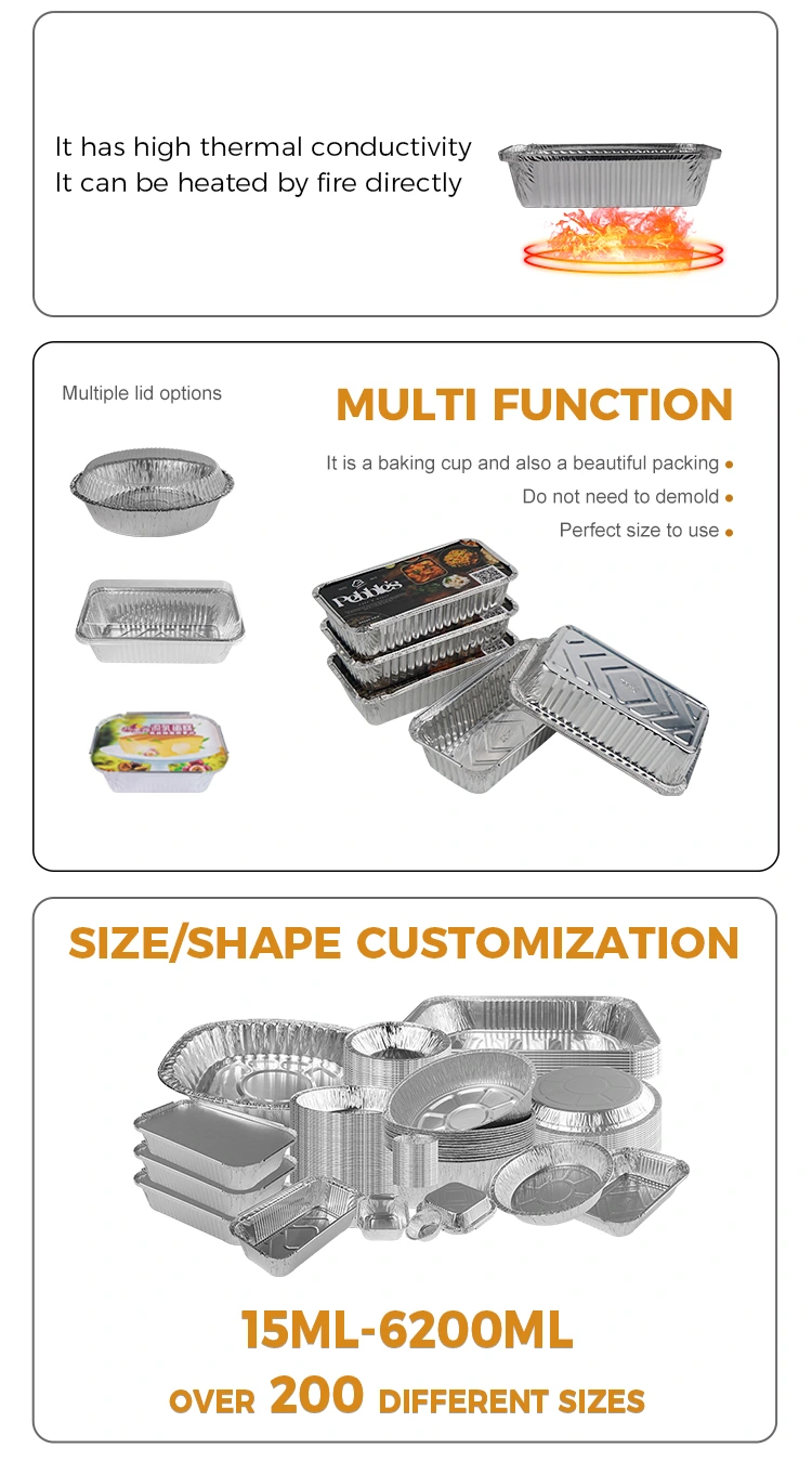 „Yunchu“ aliuminio folijos tiekėjas, stačiakampio kepsninės sutirštėjusios sidabro aliuminio folijos konteineriai yra geras kepsninės, karšto puodo, kepimo, pakavimo pakuotės, įvairūs virimo įgūdžiai, kuriuos galima atlikti, įvairių dydžių, įvairių dydžių, yra tinkami įvairiems vazonėliams ir tt. Programos, šilumos ir aliejaus atsparumas, lengvai kepimas, kepsninės lauke, laikini dubenys nebijo ugnies, kai naudojami, reikia dėti maistą ar sriubą, neišdžiovinkite be vandens, buitinės krosnys yra švarios ir patogios disponuoti indais.