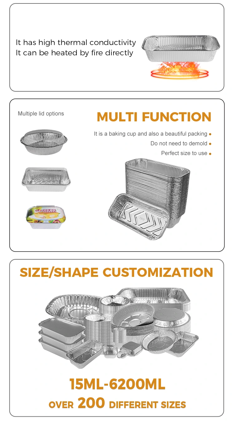 Savybės: Pietų dėžutė didmeninė 8011 aliuminio folijos medžiaga yra pagaminta iš gero šilumos išsaugojimo, kuris gali išlaikyti maisto temperatūrą ir padaryti maistą skanesnį. Be to, mūsų stačiakampė kepsninės sidabro aliuminio folijos konteineris taip pat turi šilumos išsaugojimo funkciją, kurią galima suderinti su aliuminio folijos popieriaus dangčiu ir naminių gyvūnėlių plastiko dangčiu, kuris jums patogu pritaikyti savo logotipą, dar labiau pagilinti klientų įspūdį ir sustiprinti jūsų prekės ženklo įvaizdį.