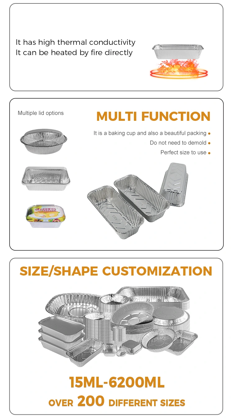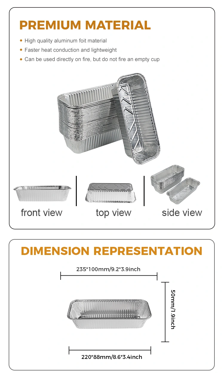 Stačiakampės duonos skardos kepimo skardos sidabro aliuminio folijos konteineriai, kuriuos teikia „Yunchu“ aliuminio folijos tiekėjas, yra įvairių dydžių ir specifikacijų, tinkančių visų rūšių puodų įrangai. Nesvarbu, ar tai didelė grotelės, ar maža namų krosnelė, ji gali lengvai su ja susitvarkyti. Jis yra įvairių dydžių ir gali patenkinti įvairių atvirų liepsnos kepsninių poreikius, nesvarbu, ar tai lauko kepsninė, ar laikinas naudojimas kaip patiekalas, nebus jokių problemų.
