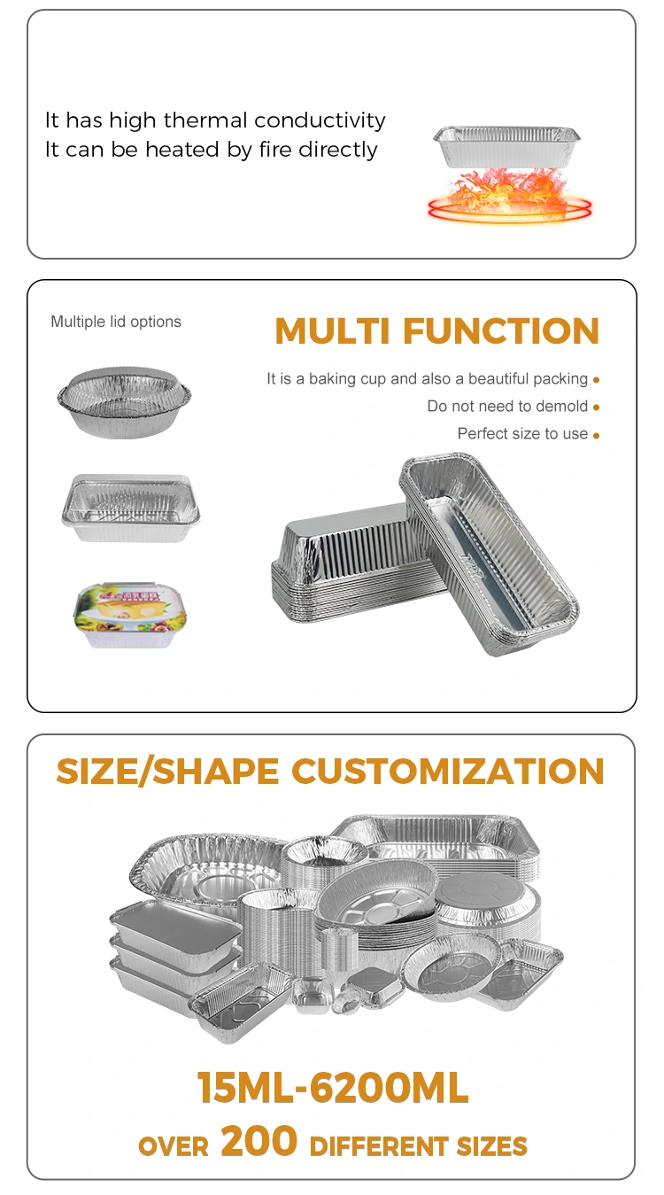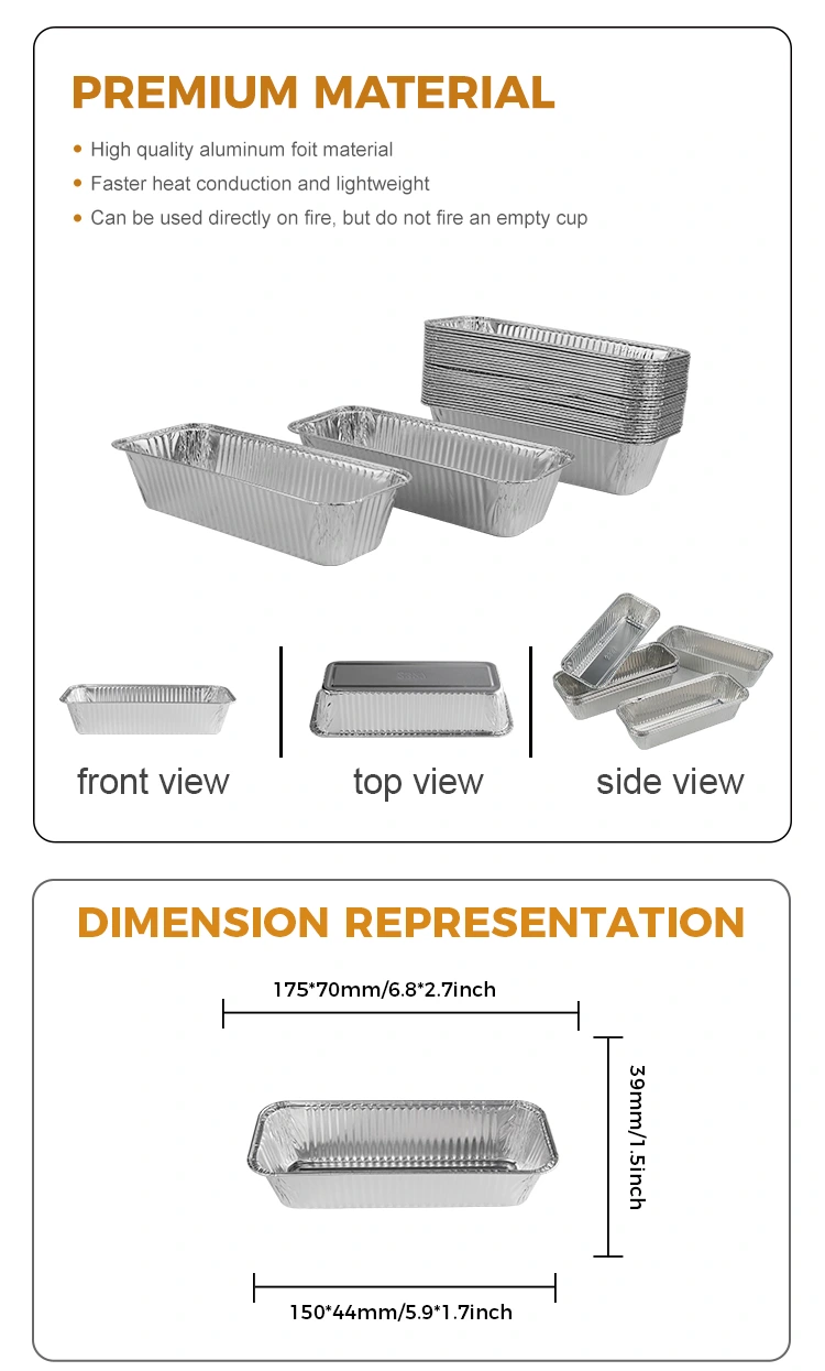 Stačiakampio duonos dėklo sidabro aliuminio folijos konteineriai, kuriuos teikia „Yunchu“ aliuminio folijos tiekėjas, yra pagamintas iš maisto kokybės medžiagų ir tinka įvairiems taikymo scenarijams. Šis produktas yra ypač tinkamas kepimo ir kepimo tikslams, pavyzdžiui, gaminti ilgus duonos ar kepimo kepalus. Nesvarbu, ar tai medžio anglies kepimas, ar kaip išsinešimo dėžutė, ji puikiai tinka naudoti.