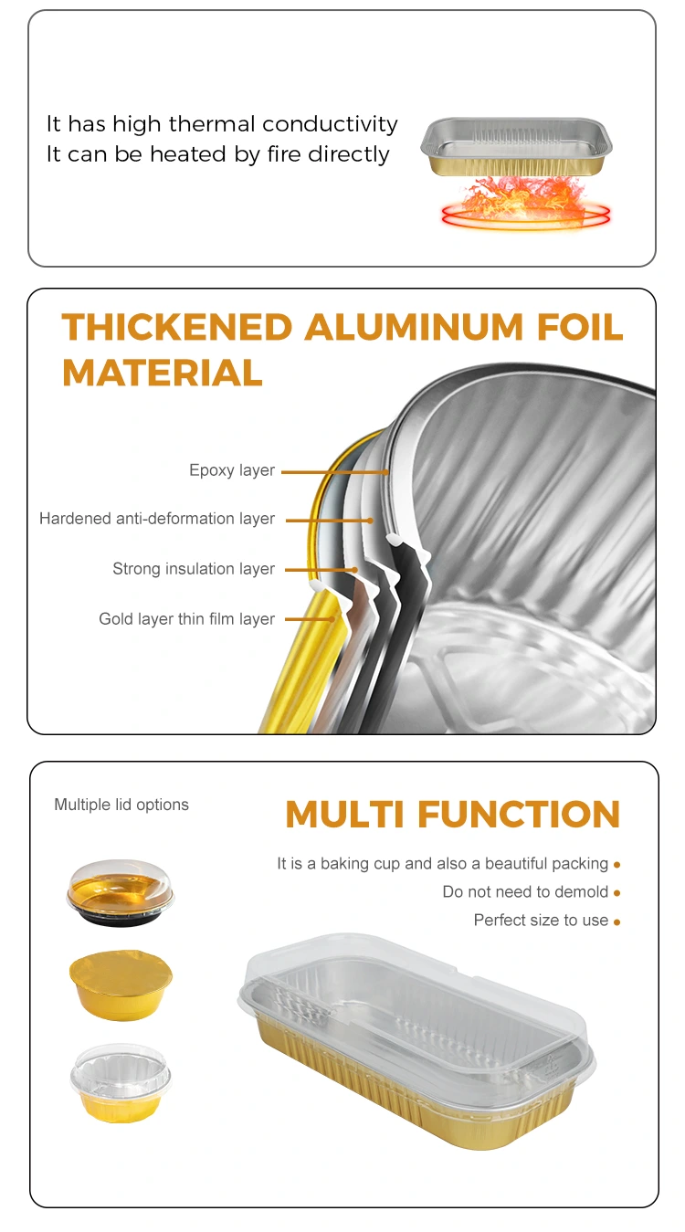 Maitinimas išsinešimui: tinka vakarietiško stiliaus lengvų patiekalų ir keptų desertų pristatymui. Auksinė išvaizda pagerina prekės ženklo įvaizdį, o aliuminio folijos medžiaga taip pat gali atlikti tam tikrą vaidmenį išsaugant šilumą.
