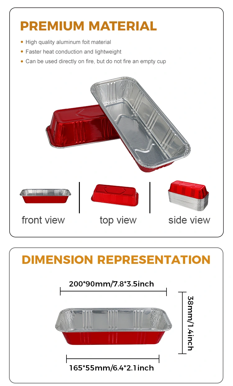 „Yunchu“ aliuminio folijos tiekėjo stačiakampės raudonos kepyklos sidabrinės aliuminio folijos talpyklos pasižymi patvariu, orkaitėje saugiu dizainu. Jie išlieka stabilūs net esant aukštai temperatūrai ir atvirai liepsnai, atlaiko aukštesnę nei 220 ℃ temperatūrą, užtikrina tolygų šilumos pasiskirstymą, kad nesudegtų, ir pasižymi tvirtu sandarumu, kad būtų užfiksuotas šviežumas (neleidžia orui ir drėgmei, duona išlieka minkšta net atvėsus). Jie taip pat suteikia aplinkosaugos ir estetinių pranašumų. Pagaminti iš maistinės aliuminio folijos, jie atitinka pakuočių perdirbimo standartus ir gali būti perdirbami teisėtais kanalais po šalinimo, sumažinant vienkartinių plastikinių tarų naštą aplinkai. Pailginta forma tiksliai atitinka ilgų duonos kepalų matmenis, išlaikant tešlos formą ir neleidžiant išsiplėsti bei deformuotis kepant. Tai užtikrina, kad po kepimo duona išsaugo nepažeistą, pailgą išvaizdą, todėl gaminys atrodo patrauklesnis, ypač tinkantis komercinėms aplinkoms.