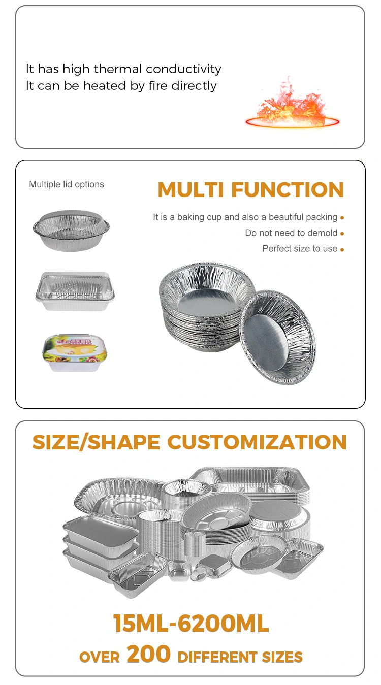 Šis apvalus kiaušinių pyragas užkandžiams sidabro aliuminio folijos maisto talpykloje yra pagamintas iš 8011 maisto kontaktinės klasės aliuminio folijos medžiagos, užtikrinant, kad būtų saugumas kontaktuojant su maistu, nėra lengva deformuoti ir nėra lengva nutekėti. Jo storis yra stiprus, atsparus korozijai, atsparumui aukštai temperatūrai ir ilgesnį tarnavimo laiką.