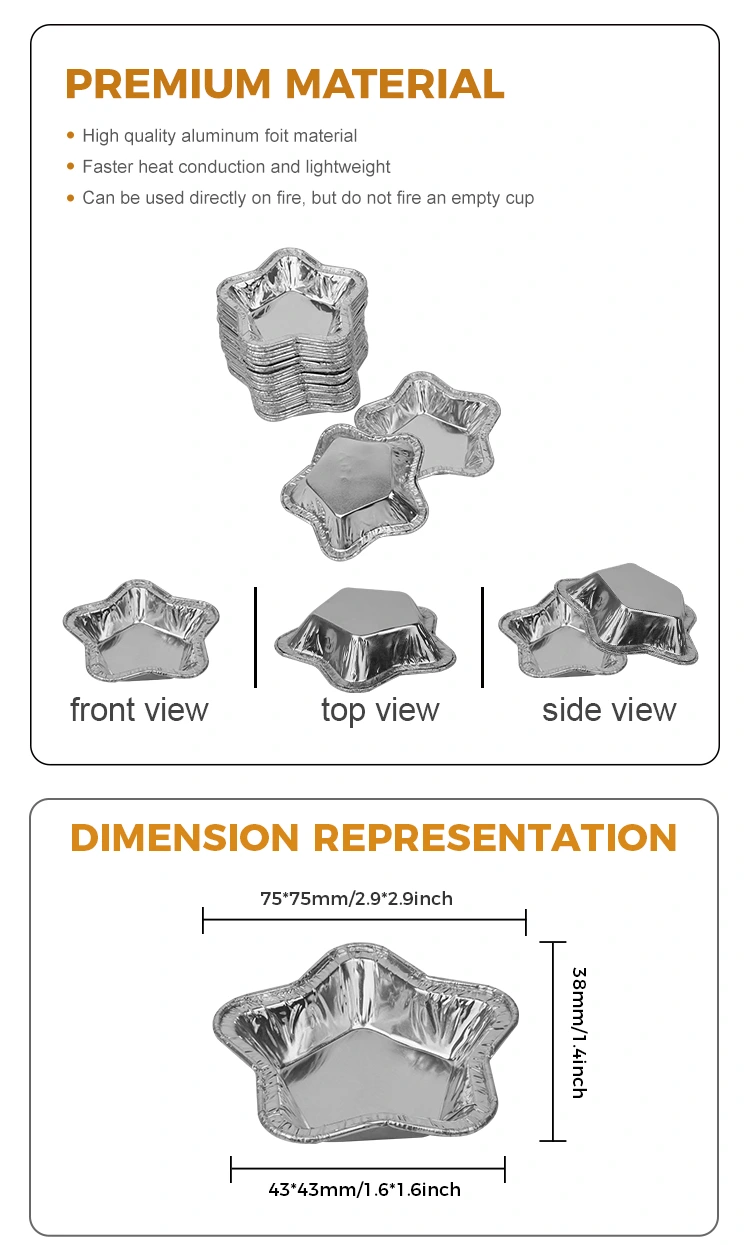 Žvaigždės formos aliuminio folijos pyrago puodeliai yra pagaminti iš sidabrinės aliuminio folijos ir yra atsparūs aukštai temperatūrai, išlieka stabilūs nuo -20°C iki 300°C. Jie tinkami kepimui ir gruzdintuvėms bei gali apsaugoti nuo prietaiso vidinių sienelių pažeidimo. Jie yra vienkartiniai, todėl patogūs, nes nereikia valyti.