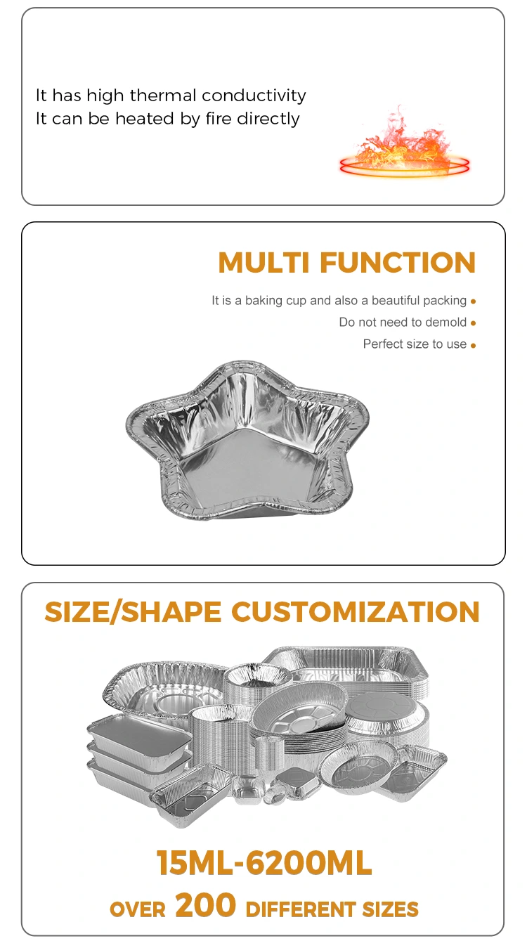 Yunchu aliuminio folijos tiekėjas Žvaigždės formos aliuminio folijos pyrago puodeliai kepimui Aliuminio folijos maisto konteineris, sutirštintos aliuminio folijos skardos formos, stabilios formos, pagamintos iš maistinės aliuminio folijos medžiagos, todėl ją lengviau išimti iškepus. Šis žvaigždės formos aliuminio folijos pyrago puodelis, skirtas kepti Aliuminio folijos maisto konteineris yra atsparus aukštai temperatūrai, nėra lengvas sudeginti ar prilipti, su suprojektuotu ir apdorotu dugnu ir kraštais, užtikrinančiais tolygų šilumos laidumą, sutirštintu ir sustiprintu integruotu liejimu, dažniausiai naudojamas kepimui ore, garuose, kepimui ir kt.